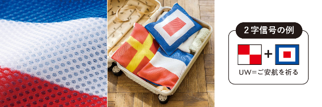 中身が透けにくいダブルメッシュ素材です。旅をするときの仕分けポーチとしても使えます。帰宅後はそのまま洗濯機に入れて洗えるので便利です。ポーチを全種類集めたら、2枚の国際信号旗を組み合わせて作る「2字信号」を最大23種作ることができます。