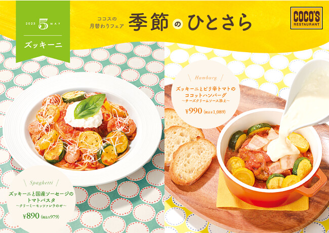 5月のメニューは、旬の食材“ズッキーニ”と初夏にぴったりなピリ辛な味わいがポイントです。素揚げをしたみずみずしいズッキーニは、表面のシャキシャキ食感と実のジューシーな味わいをお楽しみいただけます。ズッキーニのイエローとグリーンが演出する華やかな彩り、サルサソースや唐辛子の程よい辛みをココスの新定番“ココットハンバーグ”と自慢の本格パスタでご堪能ください。 ぜひこの機会に、お近くのココスで「季節のひとさら~5月~」をお楽しみください。