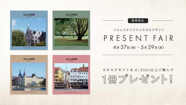 北欧家具・雑貨を取り扱うライフスタイル専門店『ILLUMS(イルムス)』(株式会社イルムスジャパン 本社:東京都渋谷区 代表者:高際兼一)は、2023年4月27日(木)~5月29日(月)までの期間、「イルムスオリジナルカタログギフト プレゼントフェア」を開催いたします。期間中は、ILLUMS 青山店とILLUMS online store にて、対象のカタログギフトを41,800円(税込)以上ご購入いただいた方に、ご購入金額に応じたイルムスオリジナルカタログギフトを1冊プレゼントいたします。イルムスオリジナルカタログギフトは結婚内祝いや引き出物としてだけでなく、急遽お手土産やプレゼントが必要になった際の贈り物のストックとしても重宝します。ぜひこの機会にご検討くださいませ。