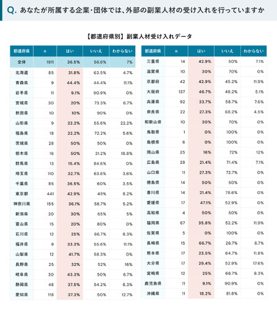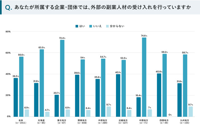 「あなたが所属する企業・団体では、外部の副業人材の受け入れを行っていますか」と尋ねたところ、「はい」が36.5%。「いいえ」が56.6%となりました。受け入れを行っている企業・団体は、全国で約4割となりました。地域別では、近畿地方(40.1%)、四国地方(40.8%)、関東地方(39.6%)の順に副業人材の受け入れ率が高い結果となりました。