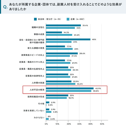 ・副業受け入れの効果を感じるポイントは、自治体・官公庁/企業ともに“はたらき手の確保”
