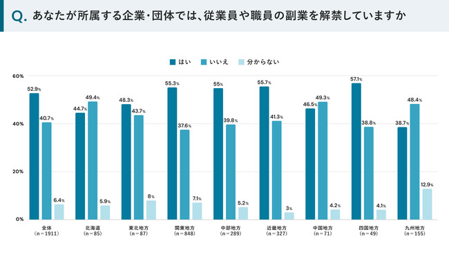 全国の自治体・官公庁/企業の人事、経営企画、経営者部門の方を対象に、「あなたが所属する企業・団体では、従業員や職員の副業を解禁していますか」と尋ねたところ、「はい」の回答は52.9%となりました。全国的に見て、副業を解禁している企業・団体が約半数であることが分かります。また、地域別でみると、四国地方(57.1%)、近畿地方(55.7%)、関東地方(55.3%)、中部地方(55.0%)、において副業解禁率が全体よりも高いことが分かりました。