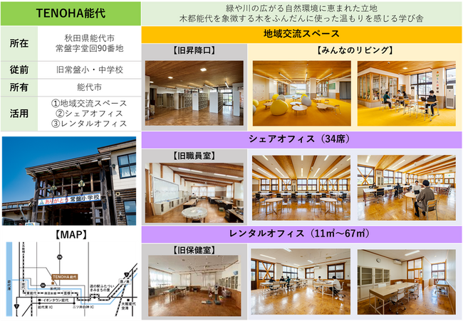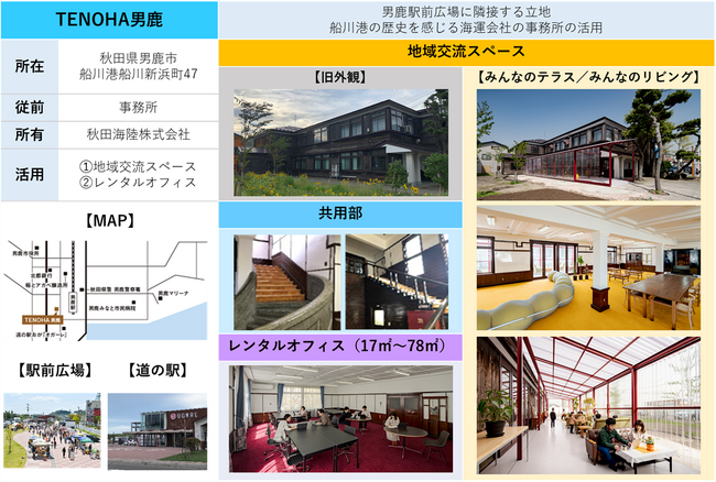 能代市においては、2020年に閉校した旧常盤小・中学校の一部を能代市より賃借し、男鹿市においては、男鹿駅前に位置する秋田海陸株式会社の事務所を賃借し、リノベーションを行った上で、「地域交流スペース」や「産業支援スペース」を創出します。