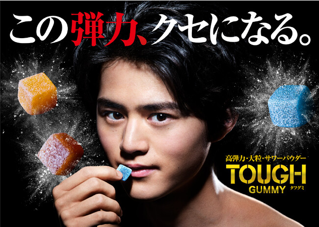 「タフグミ」は、クセになる高弾力食感とサワーパウダーが特徴の大粒グミです。その特徴を、いつもの鈴鹿央士さんの印象とは異なる「タフで力強い」表情で表現しています。