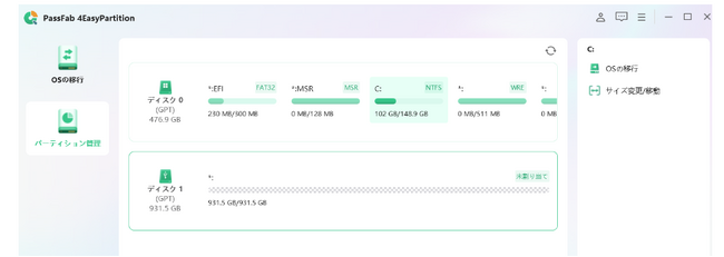 まず紹介するのはデータを失うことなくパーティションを管理するソフトPassFab 4EasyPartitionです。PassFab 4EasyPartitionはパーティションのリサイズ、作成、削除、分割、およびフォーマットを素早く行い、PCのディスク管理を簡略化できるツールです。初心者でも画面に指示が表示されるため、操作がしやすいパーティションのサイズ変更、移動のほかにもパソコンのデータをすべて別のパソコンに移すといった作業も可能です。ここでは、パーティションのサイズ変更についての作業方法をご紹介します。
