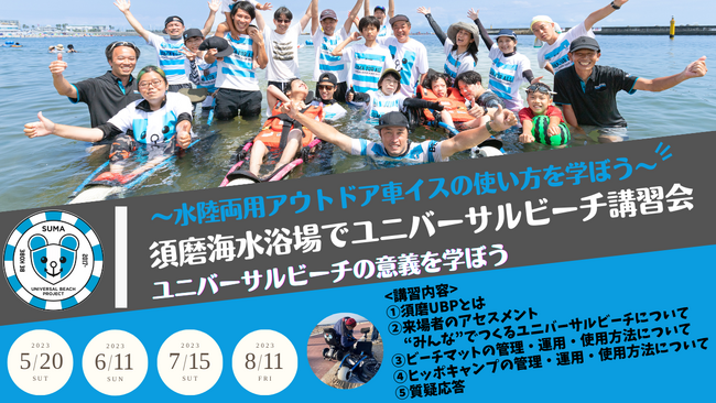 NPO法人須磨ユニバーサルビーチプロジェクトは、2023年度須磨海水浴場の海開きに向けて、車椅子の人でもそうでない人でも海水浴を楽しんでもらうために開催します。2019年より毎年開催していたユニバーサルビーチですが、今年はさらに安全に楽しんでいただくために、ユニバーサルビーチの意義と、水陸両用アウトドア車イスヒッポキャンプの使い方を学べる講習会を、5/20(土)、6/11(日)、7/15(土)、8/11(金・祝)の全日10時~12時で開催します。(日程変更の場合は公式SNSにて案内予定)