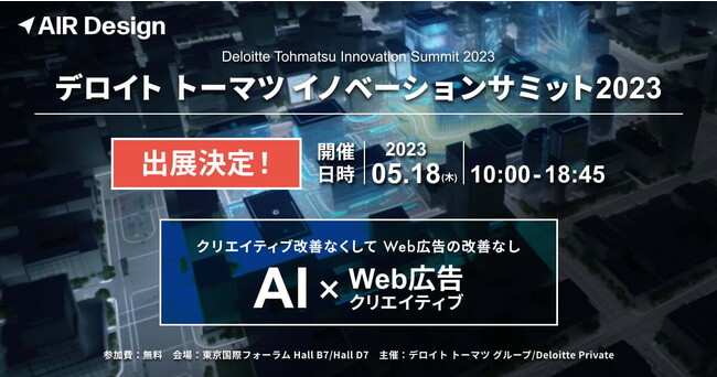 マーケティングのプロによるAIを活用した広告クリエイティブ制作・改善サービス「AIR Design(エアデザイン)」を展開する株式会社ガラパゴスは、2023年5月18日(木)に東京国際フォーラムで開催される「Deloitte Tohmatsu Innovation Summit 2023」にブースを出展いたします。