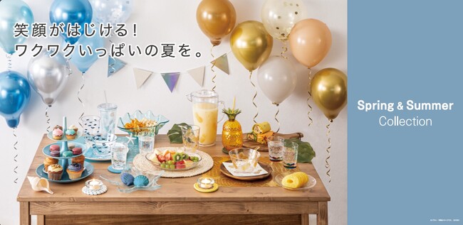 食卓を元気に明るくするイエロー・ゴールドが華やかなパインシリーズ、涼しげなブルーが特徴の、海をテーマにした爽やかなオーシャンシリーズ、キラキラ輝くオーロラシリーズの3シリーズをご用意。タンブラーやボウル、ランチョンマットなど51アイテムを期間限定で発売します。ポップなアイテムで、日常の食卓にワクワクを取り入れませんか。