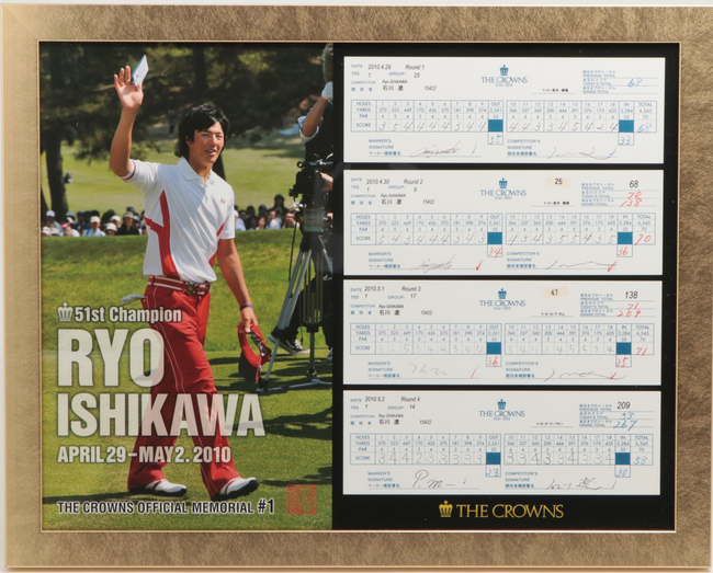 本オークションで出品するアイテムは、石川遼プロの「58」スコアカード(レプリカ)です。2010年5月2日に行われた「第51回中日クラウンズ」にて当時18歳であった石川遼がツアー最少スコア「58」という驚異的なスコアを叩き出し優勝。当時、世界最少ストロークとしてギネスにも認定された「58」のスコアカードのレプリカをメモリアルフレームにしてお届けいたします。各アイテムが世界に一つずつしか存在しない、シリアルナンバー入りの貴重なアイテムです。この機会にぜひ手に入れてください。
