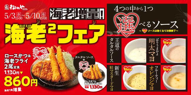 株式会社松屋フーズ(本社:東京都武蔵野市、代表取締役社長:瓦葺 一利)では、とんかつ専門店の「松のや・松乃家」におきまして、2023年5月3日(水)午後3時より、お値段変わらずに海老フライを1本増量できる「海老えびフェア」を開催いたします。