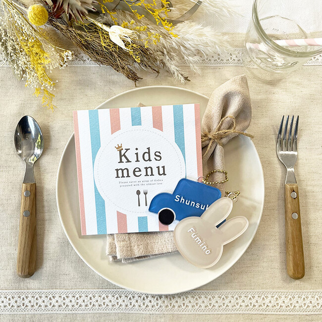 今回のアイテムは、プレ花嫁さまよりいただいていた「大人とは違うメニューだから別でかわいいのがほしい!」「喜ばれるプレゼントを用意したい!」という声により生まれました。慣れない場所で頑張ってくれるお子様ゲストをかわいいテーブルでお迎えしましょう♪
