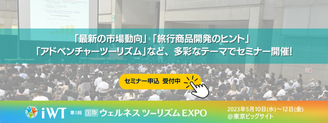 2023年5月10日(水)から5月12日(金)の3日間、東京ビッグサイトにてウェルネスツーリズムに関するセミナーを開催いたします。市場動向、アドベンチャーツーリズム、ワーケーションなど、最新情報が満載。旅行会社やメディア関係者、企業の総務人事の方必聴の内容となっております。ぜひご来場ください。(※事前申込制。定員になり次第、締切)