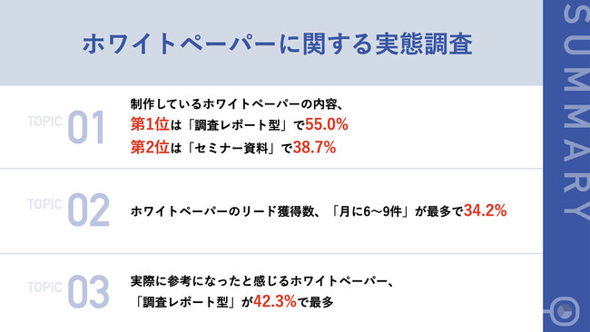 今回の調査では、ホワイトペーパーを活用している企業の多くが、「調査レポート型」を取り入れており、リードや商談に繋がっている実態が明らかとなりました。「調査レポート型」のホワイトペーパーは、担当者が発信するだけでなく、閲覧する情報としても参考にしているという回答も得られており、今後企業の情報発信において、「調査レポート型」のホワイトペーパーが存在感を増していくと言えるのではないでしょうか。