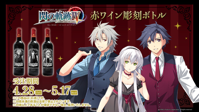 ストーリーRPG『英雄伝説 閃の軌跡』シリーズのキャラクターたちが描かれた彫刻ボトル(赤ワイン)が、eeo Store(通販)にて4月28日(金)~5月17日(水)の期間限定で販売されることが決定しました。