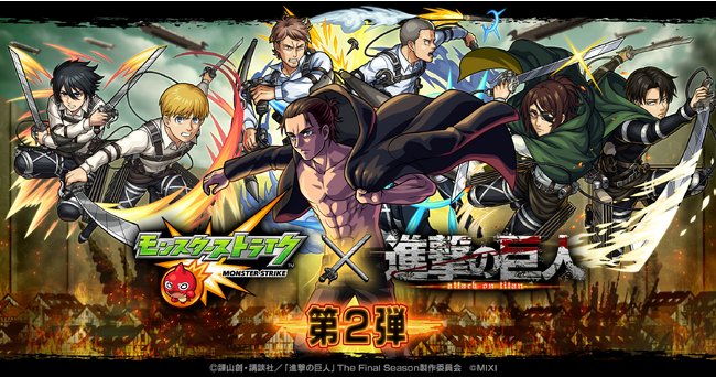 株式会社MIXI(東京都渋谷区、代表取締役社長:木村 弘毅)は、スマホアプリのひっぱりハンティングRPG「モンスターストライク」(以下モンスト)において、アニメ「進撃の巨人」とのコラボ第2弾を5月1日(月)0:00より開催します。