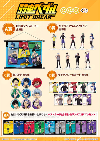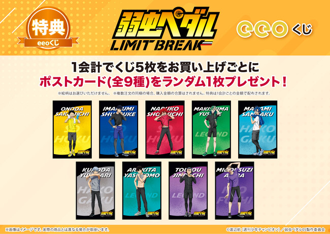 TVアニメ『弱虫ペダル LIMIT BREAK』の「eeoくじ」を1会計で5枚お買い上げごとに、ポストカード(全9種)をランダムで1枚プレゼント!
