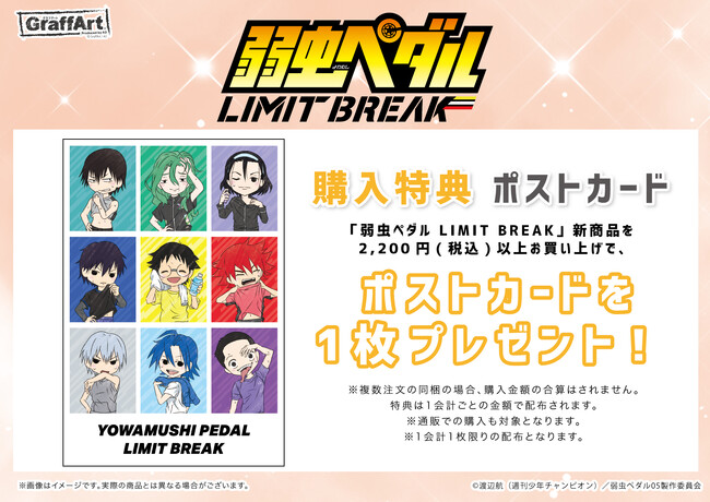 『弱虫ペダル LIMIT BREAK』新商品を2,200円(税込)以上お買い上げの方に、ポストカード(全1種)をプレゼント。通販でのご購入も対象になるので、ご来店が難しい方は通販サイト「eeo Store」でぜひゲットしてみてください!