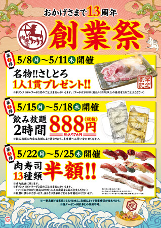 そして、国内外多くのお客様にご愛顧いただき、今年で創業13周年を迎えることができました。今回、これを記念して、これまで支えてくださったお客様への感謝を込めて、全国の肉寿司※で3種類のキャンペーンを異なる期間で実施する「創業祭」を開催いたします。ぜひお近くの肉寿司へご来店ください。皆様のご来店を従業員一同、心よりお待ちしております。