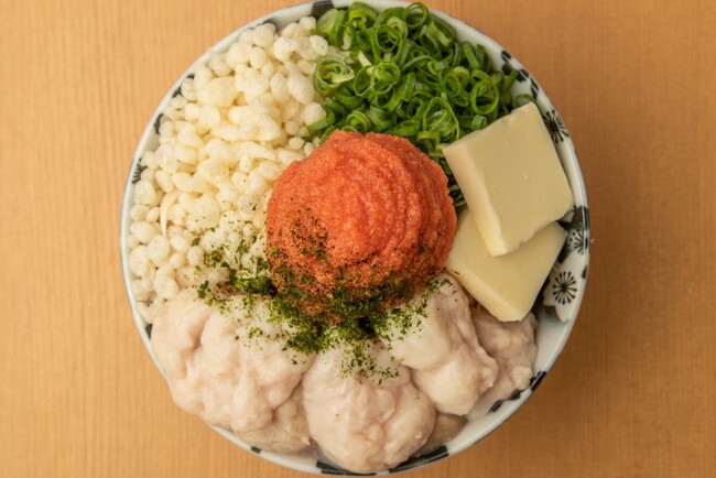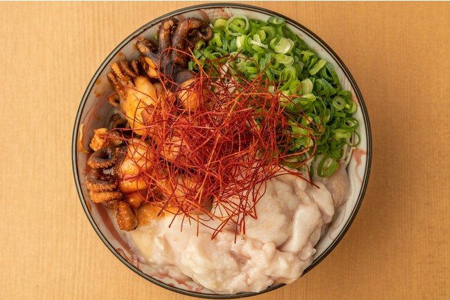 冬に限らず、オールシーズン「九州黒太鼓」の名物としてご愛顧いただいている「もつ鍋」。新鮮で大ぶりな牛の生もつは、ぷりっぷりで、鉄板で焼くことにより、旨みたっぷりの脂が溶け出し、生地に味の深みを加えます。定番の醤油、塩、とろろのシンプルな和風味に加え、明太子&バター醤油、カレー&チーズの味の洋風な変わり種、さらにz世代から熱視線を集めるチュクミを使ったものまで全6種のヴァリエーションをお楽しみください。