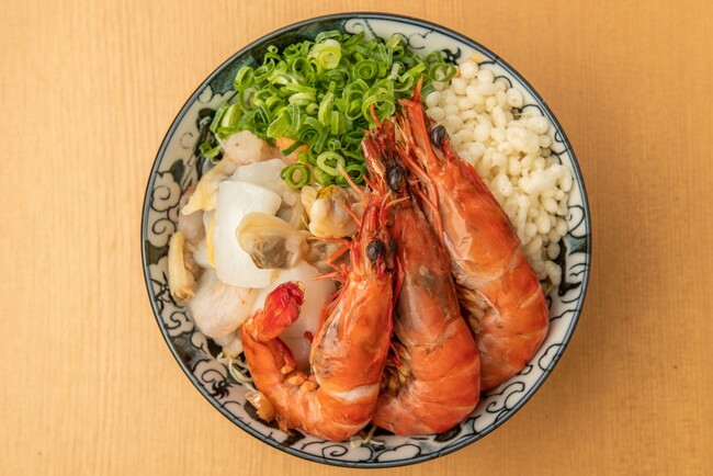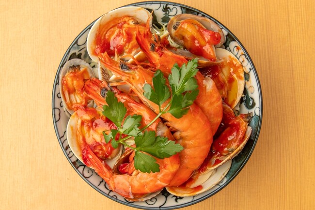 ペスカトーレもんじゃ 1,580円大ぶりのエビとアサリの出汁がたっぷりと溶け込んだ魚介の旨みを存分に味わえるトマトソースもんじゃ。ニンニクも効いたその味わいは、意外にも「九州黒太鼓」の焼酎や日本酒とのペアリングがオススメ。