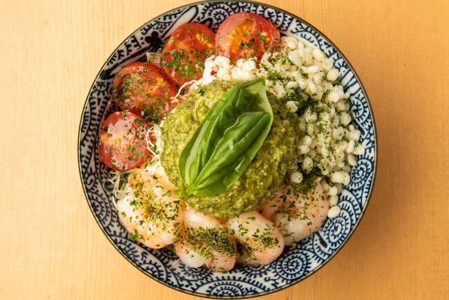 ジェノベーゼもんじゃ 1,430円爽やかなバジルの風味と、ミニトマトの酸味が、オリーブオイルと混ざり合って醸し出すフレッシュな味わいと香りが魅力のパスタ「ジェノベーゼ」。もんじゃ焼きと出会ったら…新しい味の世界が開かれます。