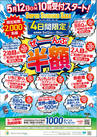 信和グループ・信和ホテルズ株式会社(本社:神戸市東灘区)が運営する「ホテルプラザ神戸」と「ライズホテル大阪北新地」は、5月12日(金)~15日(月)の4日間限定で、スーパーサマーセールを開催いたします。宿泊とセットになったお食事などが半額になる特別プランを販売いたします。