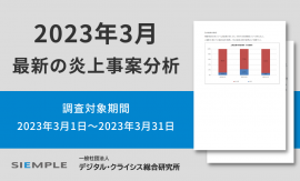 ネット炎上や情報漏えいなどのデジタル上で発生したクライシス(危機や重大なトラブル)を研究する、日本初の研究機関、一般社団法人デジタル・クライシス総合研究所(以下、デジクラ総研)はシエンプレ株式会社と共同で、2023年3月1日~3月31日に発生したネット炎上についての件数とその内訳の分析結果を公開しました。