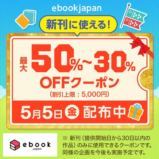 電子書籍販売サイト「ebookjapan」をヤフー株式会社と協力して運営する株式会社イーブックイニシアティブジャパンは、ebookjapanで電子書籍を最大50%から30%OFFで購入できるクーポンを、2023年5月5日(金)に配布します。