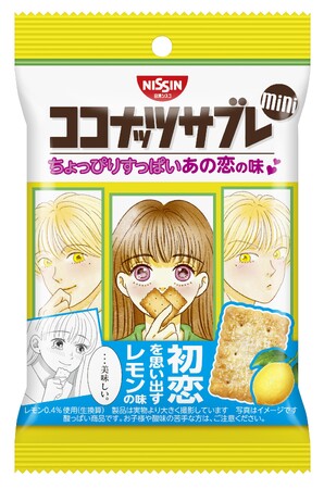 「ココナッツサブレ」のほんのりとした甘みとレモンパウダーのすっぱさが織りなす、爽やかな味わいが特長です。パッケージは、初恋の味をイメージした少女漫画風のデザインです。