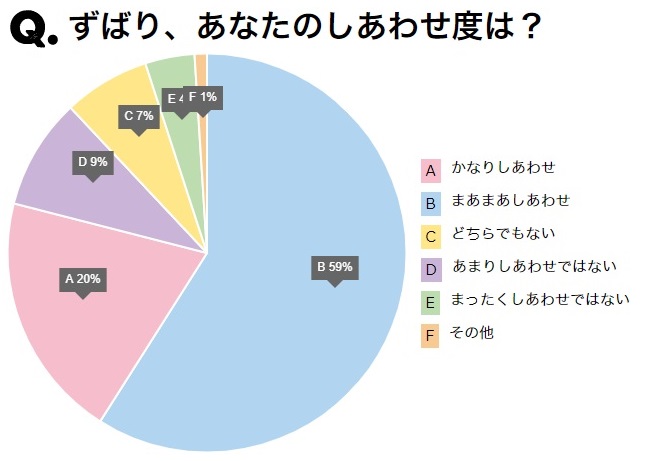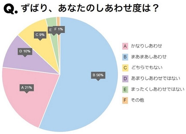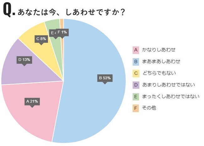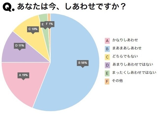・更年期で何となく不調、子供の独立間近で寂しい、職場が不景気でいつまで働けるのか不安・・・と、幸せいっぱいとは言い難いですが、特に病気ケガもなく毎日ご飯が食べられるのはありがたいことと思うと何とも言えないです。(どちらでもない)