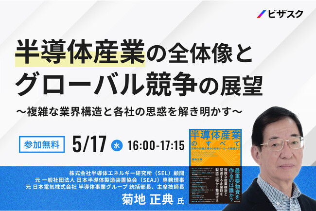 「知見と、挑戦をつなぐ」をミッションにグローバルなナレッジプラットフォームを運営する株式会社ビザスク(以下、当社)は、「半導体産業の複雑な業界構造と各社の思惑を解き明かす」をテーマに、23年3月発売のベストセラー「半導体産業のすべて 世界の先端企業から日本メーカーの展望まで」他、多数の半導体関連書籍を手掛けられている、株式会社半導体エネルギー研究所(SEL)顧問 菊地 正典氏ご登壇による無料オンラインセミナーを、5/17(水)16時より開催します。