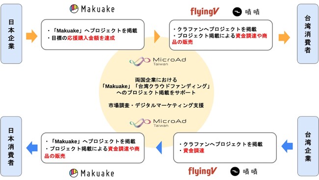具体的には、マイクロアド台湾が、クラウドファンディングへのプロジェクト掲載から、台湾現地における広告運用を含めたデジタルマーケティング、物流面のサポートまでを一気通貫で行ないます。