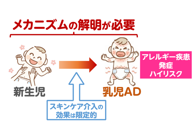 これまでの疫学研究から、乳児期のアトピー性皮膚炎「(以下、AD)」は、皮膚についた異物に対してアレルギーをおこす「経皮感作」のリスクとなり、その後のアレルギー性疾患の発症と関連することが知られています。