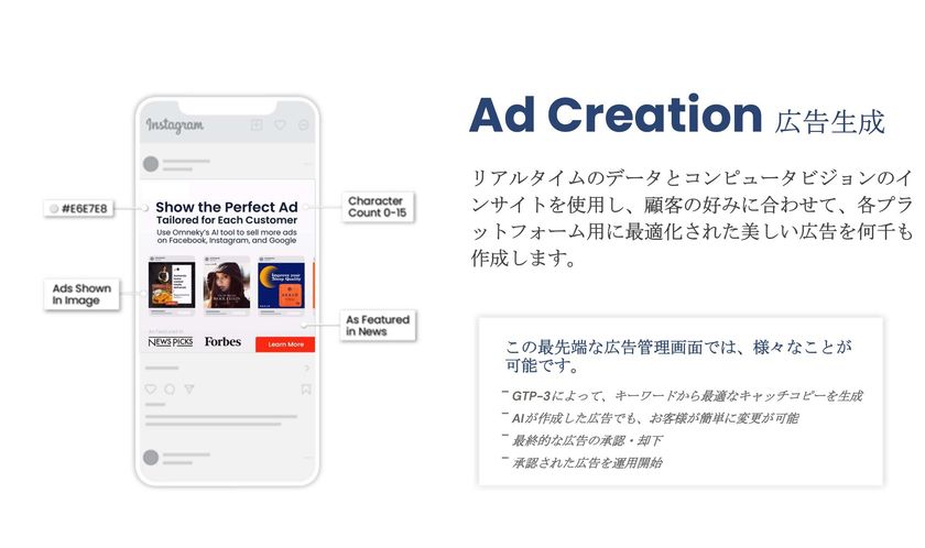 最先端のディープラーニングによる高度なAI広告分析システムを開発するOmnekyのCEOである千住光氏は、「ビートコミュニケーションと協力して、当社のAIマーケティング・プラットフォームを日本の企業に提供できることを嬉しく思います。日本は当社にとって重要な市場であり、ビートコミュニケーションの幅広い専門知識と現地市場の知識により、日本の企業に一流のサービスを提供することができると確信しています。Omnekyのミッションは、広告の民主化です。最先端のディープラーニングを活用し、すべてのデジタルチャネルで広告制作をパーソナライズします。Omnekyの機械学習アルゴリズムは、お客様が共感しているデザインやメッセージを分析することで、企業が最大の効果を発揮するキャンペーンを展開することができます。」