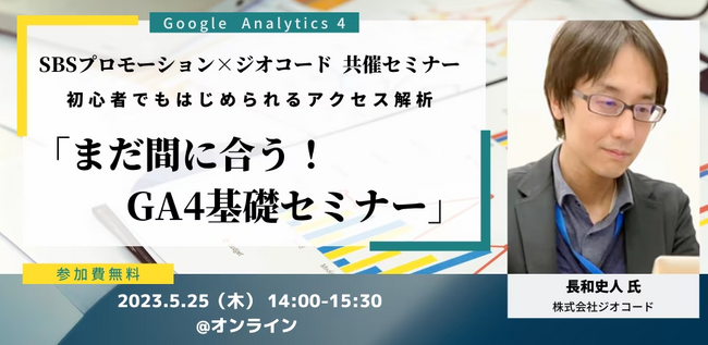 SBSプロモーション×ジオコード共催セミナー。初心者でもはじめられるアクセス解析「まだ間に合う!GA4基礎セミナー」。