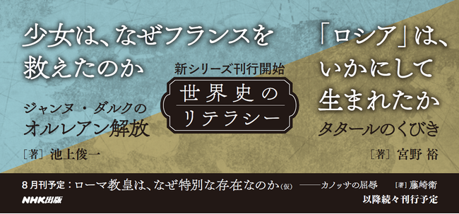 歴史を一つの事件から読み解く新シリーズ「世界史のリテラシー」が、NHK出版より2023年5月10日に発売になります。刊行第1弾は、池上俊一さんの『少女は、なぜフランスを救えたのか――ジャンヌ・ダルクのオルレアン解放』と、宮野裕さんの『「ロシア」は、いかにして生まれたか――タタールのくびき』。ともに国家統合や国家形成という、現代ヨーロッパ世界を読み解くキーワードを軸にした2冊です。