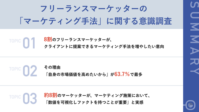 フリーランスマーケッターが、クライアントからの信頼を構築するには、よりクライアントの事業に深く入り込んだマーケティング施策を打ち出す必要がありそうです。そのためには、顧客へ調査を行い、数値を可視化するファクトコンテンツである調査PR・リサーチPRの重要性は高いといえるでしょう。