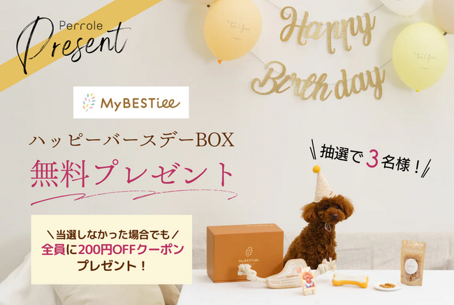 そんなPerroleが、お菓子やおもちゃ、個別のメモリアルグッズまで、愛犬の誕生日にあるとうれしいアイテム7点を詰め込んだ「MyBESTieeハッピーバースデーBOX」のプレゼントキャンペーンを企画しました。家族である愛犬の大事な記念日を楽しく過ごすための、限定詰め合わせBOXです。