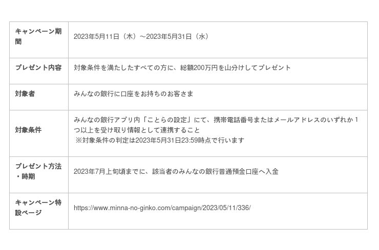 株式会社みんなの銀行(取締役頭取 永吉 健一、以下「みんなの銀行」)では、2023年5月11日から2023年5月31日の間、みんなの銀行アプリで「ことら送金」受け取り情報の設定をしたすべての方を対象に「200万円山分けキャンペーン【ことら送金設定篇】」を実施します。