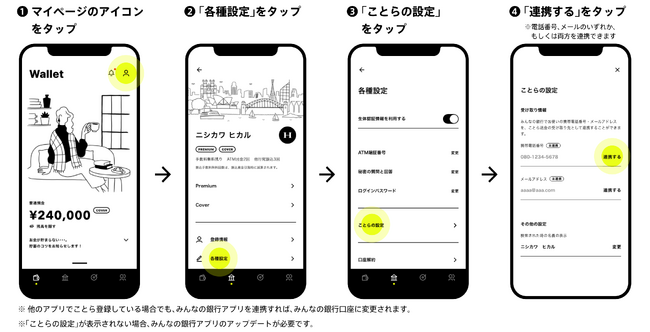 また、ご自身が送金を受け取る場合、みんなの銀行アプリに連絡先の事前設定をしていただければ、連絡先でお金を受け取ることができます。なお、みんなの銀行アプリで連携できる連絡先は、みんなの銀行にお届けの携帯電話番号とメールアドレスです。