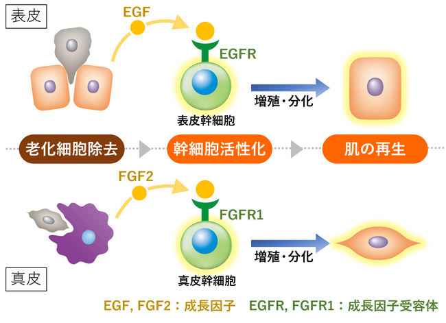 肌の老化を促進する老化細胞に対して、表皮では、老化細胞に隣接する表皮基底細胞が老化細胞を押し出すように除去します。除去を行った表皮基底細胞は成長因子を分泌し、それが表皮幹細胞の受容体で感知されると、幹細胞から新しい細胞が生まれます。一方、真皮では、マクロファージが老化細胞を除去します。除去を行ったマクロファージは成長因子を分泌し、それが真皮幹細胞の受容体で感知されると、幹細胞から新しい細胞が生まれます。