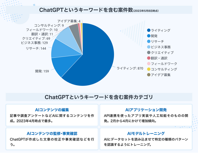 2022年11月にChatGPTが公開されてから、瞬く間に世界中で活用が進んでいます。クラウドワークス上のChatGPTというキーワードを含む案件数は5月8日時点で既に1,400件を超えており、日を追うごとに加速度的に増加しています。また、ChatGPTの使用は問題ないが、最終的にワーカー自身が目視で確認した上で納品して欲しいという「ChatGPT+ワーカー確認」の案件が多いことも特徴的で、クライアントもワーカーもChatGPTに対していわば”手探り”の状況にあると解釈しています。