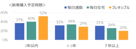 新型コロナウィルスの流行をきっかけにアメリカでもフレキシブルな勤務形態を選ぶ人が増えている。特に年齢が若く、高学歴で高収入のアメリカ人はリモートワークの選択肢が得られやすい傾向がある。新車購入意向者の中で、「在宅勤務」や「フレキシブルな勤務」が可能な人は、「毎日通勤」する人よりも、新車の購入サイクルが早い傾向があり、また電気自動車などの代替パワートレイン車への意向率も比較的高い傾向が見られた。