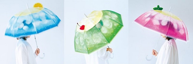 喫茶店でおなじみのレトロなクリームソーダを、そのまま表現した透明傘です。〈ブルークリームソーダ〉〈メロンクリームソーダ〉〈ピンククリームソーダ〉の3つのデザインで、繊細な泡や氷のグラデーション、少し溶けたアイスクリームのシャリシャリ感も、それぞれ水彩風イラストでリアルに再現しています。傘の上にちょこんと乗ったトッピングもポイントです。雨の日は、雨粒がグラスに付いている水滴のようで、見上げるたびに光を透かしてきらきらシュワシュワと輝く、クリームソーダのグラデーションが、よりリアルに楽しめます。