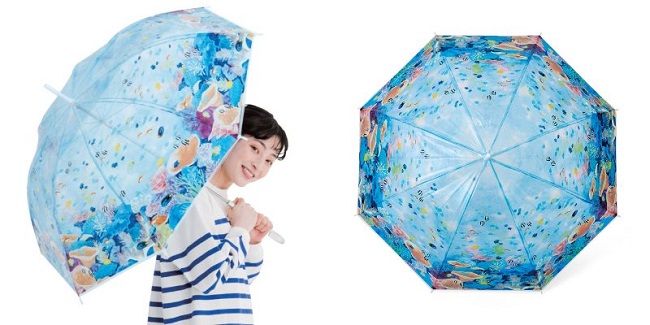 名古屋港水族館にある、生体サンゴを20種250点も展示しているライブコーラル水槽をモチーフにした傘です。飼育員さん監修のもと、鮮やかなサンゴの色合いや水のグラデーション、キラキラした光の反射など、水中の世界観を繊細なイラストでそのまま再現しています。傘を差すと頭上に美しいサンゴ礁が広がり、水槽の中にいるような気分が味わえます。