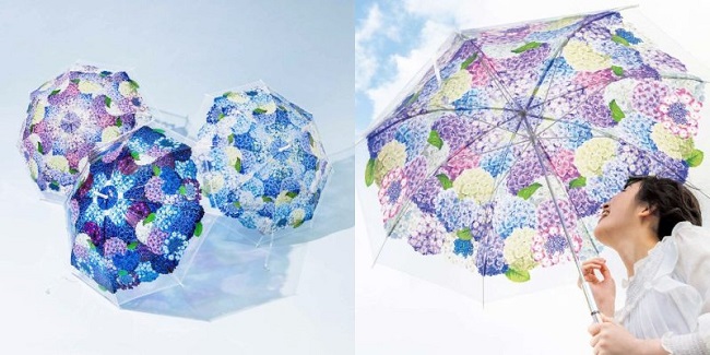 繊細かつていねいに描いたリアルな紫陽花のイラストが美しい傘です。雨の日に差せば、紫陽花の花が雨粒をまとった幻想的な姿が楽しめます。デザインは、グラデーションにこだわった〈青紫色〉〈薄紫色〉〈水色〉の3種類です。外から見れば色鮮やかな紫陽花の花束に、内側から見上げれば、まるで紫陽花が空から降り注いでいるような華やかな気分を味わえます。雨粒をイメージした、クリアビーズのチャーム付きです。