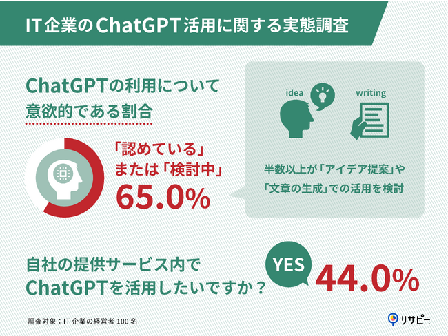 ワンストップでリサーチデータマーケティングを実現する「リサピー(R)️」(https://ideatech.jp/service/research-pr)を運営する株式会社IDEATECH(本社:東京都港区、代表取締役:石川友夫)は、IT企業の経営者100名を対象に、IT企業のChatGPT活用に関する実態調査を実施いたしましたので、お知らせいたします。