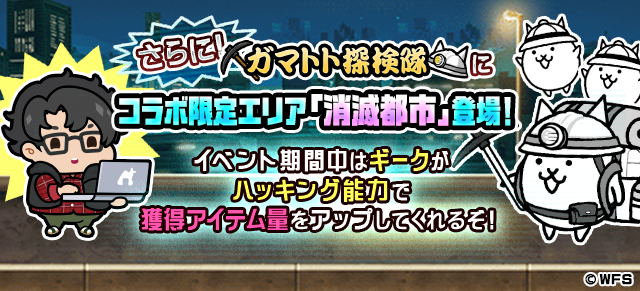 イベント期間中、「ガマトト探検隊」に「消滅都市」キャラクターのギークが登場し、獲得アイテム量がアップします。さらに期間中はコラボ限定エリア「消滅都市」が出現!