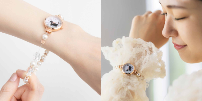 フェリシモが展開する「猫部(TM)」は、「アクセ感覚でサッと着けられる 猫と過ごす癒やし時間のビーズブレスレット」のウェブ販売を4月25日より開始しています。猫部の雑貨イラストでも人気の、イラストレーターのハラミチヨさんが描く、大人っぽい猫さんが印象的なブレスレットウォッチです。時計を見るたびに、ピンとしっぽを立てたごきげんなハチワレ猫さんと目が合って、ほっこり癒やされます。音符マークが隠されたかわいい文字盤は分刻みの目盛りが付いていて、時間をしっかり確認できるのもポイントです。ゆるやかな凸凹の風合いがあるパールビーズと、肌なじみのよいピンクゴールドを合わせたデザインは、身に着けているだけで華やかな気分にさせてくれます。上品な装いに合わせるのはもちろん、シンプルコーデのアクセントにもおすすめです。品のある華やかなブレスレットウォッチなので、アクセサリー感覚で楽しめます。販売価格の一部は飼い主のいない動物の保護と里親探し活動、野良猫の過剰繁殖防止活動、災害時の動物保護活動などに活用されます。