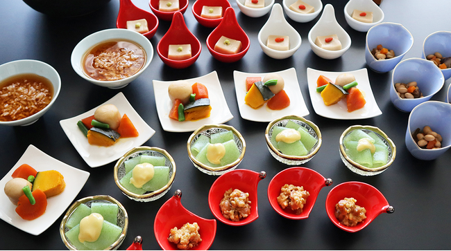 当ホテルはこれにちなみ、和歌山県 高野山の精進料理店「中央食堂 さんぼう」に監修をお願いし、5階レストラン「ダイニング ミユウ」の朝食に「精進料理コーナー」を設けて、3~4品ご提供いたします。精進料理の特徴である大豆・昆布・椎茸の植物性の食材のみから取った出汁を使い、野菜の「五目煮」や「焚き合わせ」などを当ホテルの和食職人が作り上げます。また、山椒、七味、辛子、ねぎ、にんにくなど刺激のある食材を一切使わないことも精進料理の特徴です。その他にも、「胡麻豆腐(ごまとうふ)」や「さしみ蒟蒻」、「金山寺味噌」や「茶粥」もご提供いたします。